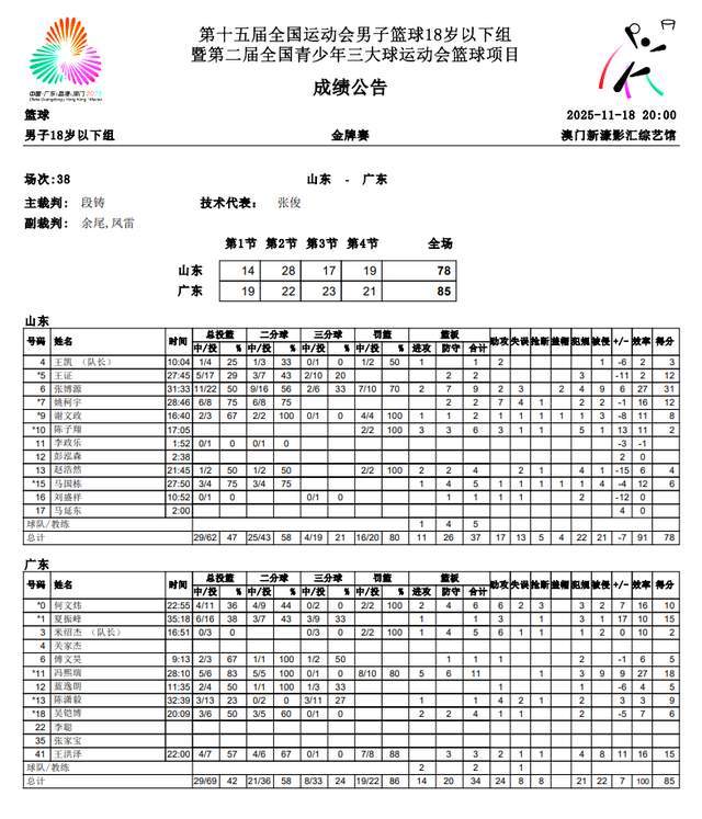 末节决战,山东队十分顽强,愣是又追了上来,一度战至68-68平,之后又战成72-72平、74-74平。姚柯宇反击打进2分,山东队第一次实现了反超。两队随后又战成78-78平。但之后,广东队连续砍分,王刚喊出暂停也白搭。最终,广东U18男篮以85-78击败山东队,斩获冠军,山东屈居亚军。