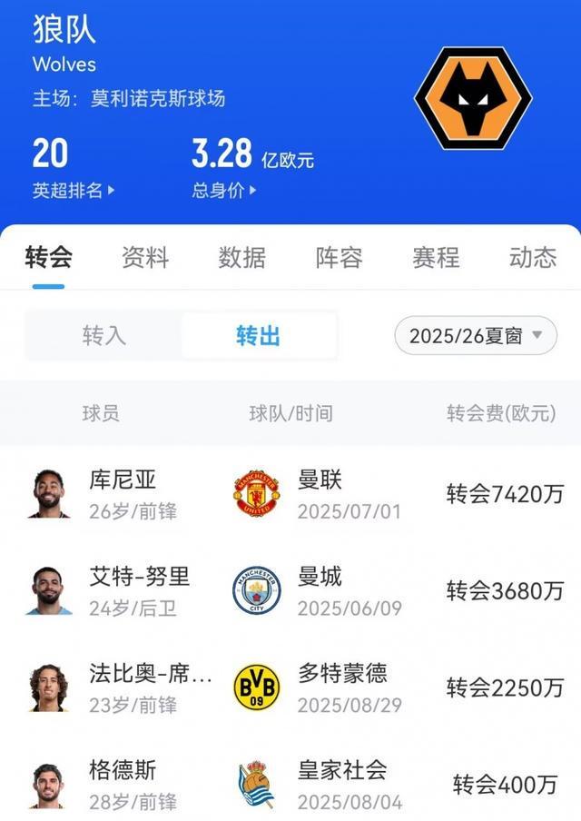今夏狼队再次遭遇球队换血:进攻核心库尼亚以7420万欧元价格加盟曼联,边后卫艾特-努里也加盟曼城。此外,前锋法比奥-席尔瓦离队加盟多特。