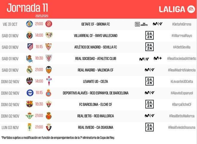 西甲官方公布了第11轮比赛的开球时间,皇马将在北京时间11月2日凌晨四点开球,巴萨将在11月3日凌晨1点半开球。